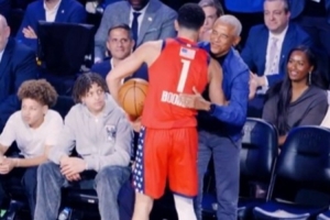 有“刺客”赶紧护驾!布克推飞约基奇 随后和奥巴马握手拥抱