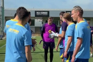 巴萨门将什琴斯尼迎来36岁生日,今日训练之前,队友们列成两排,以拍打仪式为他庆生。