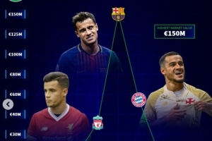 德转也回顾了库蒂尼奥生涯身价变化走势,从他加盟国米开始身价不断提升,经过利物浦时期的高光表现后,在2018年效力巴萨时期达到巅峰的1.5亿欧,随后开始不断走下坡路,经历拜仁、维拉效力后离开五大联赛,先后加盟杜海勒以及瓦斯科达迦马,目前身价仅剩350万欧。