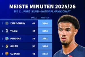 体育资讯3月13日讯 德转统计本赛季五大联赛U21球员出场时间榜,巴黎球员埃梅里3646分钟第一,伊尔迪兹第二,亚马尔第七。